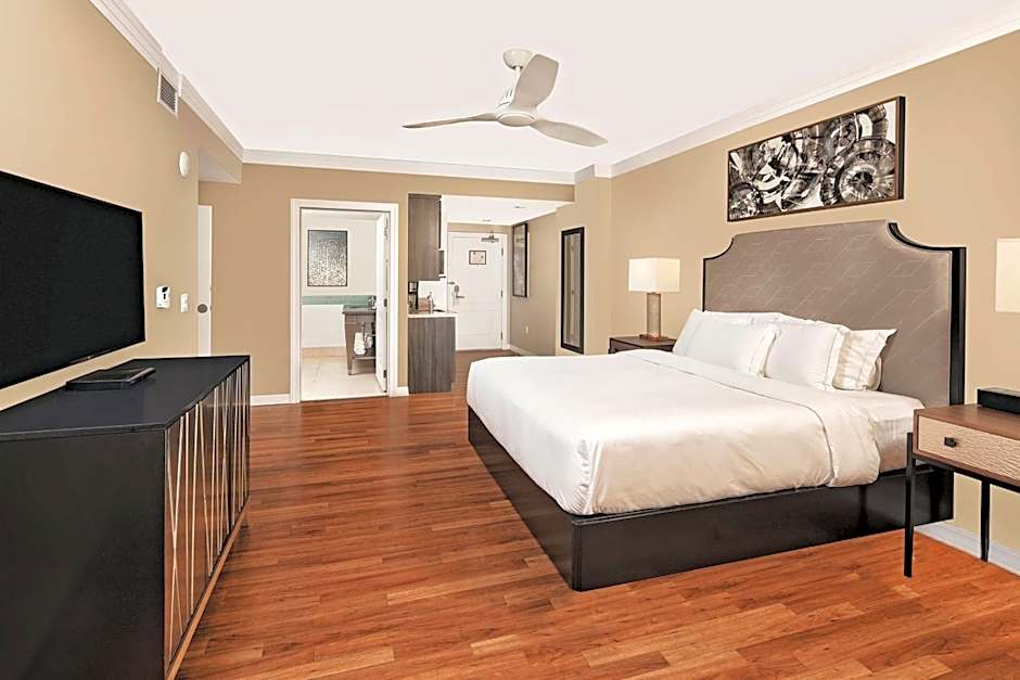 Located on the top floor, this penthouse suite features a private balcony offering panoramic views of Central Florida. Every suite includes a fully equipped kitchen with granite countertops and dark hardwoord floors as well as a living area with a sofa bed, dining area, and washing machine and dryer. The master bedroom has a sculpted bath with a ceiling-mounted spout. Two TVs are provided.